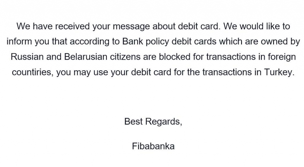 На запрос клиента банк дал такой комментарий: «В соответствии с политикой банка дебетовые карты, принадлежащие гражданам России и Беларуси, блокируются для транзакций в зарубежных странах. Вы можете использовать свою дебетовую карту для транзакций в Турции».
