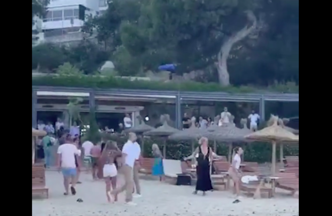 На кадрах драки видно, как люди падают на землю и как сотрудники пляжного бара пытаются вмешаться и остановить хаос, который разразился после того, как официанты попросили пьяных отдыхающий прекратить выбрасывать мусор в море.