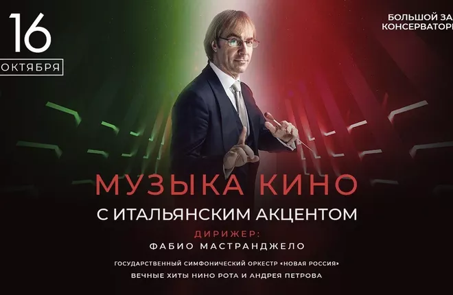 16 октября в Большом зале Московской консерватории прозвучит необычная программа «Музыка кино с итальянским акцентом», посвященная великим хитам Нино Рота и Андрея Петрова. За дирижерский пульт в этот вечер встанет прославленный итальянский маэстро Фабио Мастранджело. На концерте в исполнении государственного симфонического оркестра «Новая Россия» прозвучат знаменитые мелодии из таких киношедевров, как «Ромео и Джульетта», «Гараж», «Леопард», «Восемь с половиной», «Дорога», «Укрощение огня», «Ночи Кабирии» и многих других.