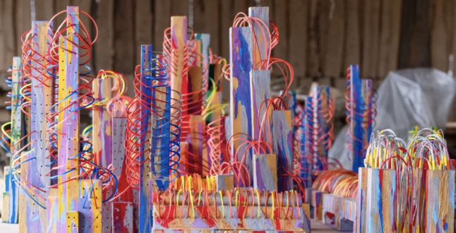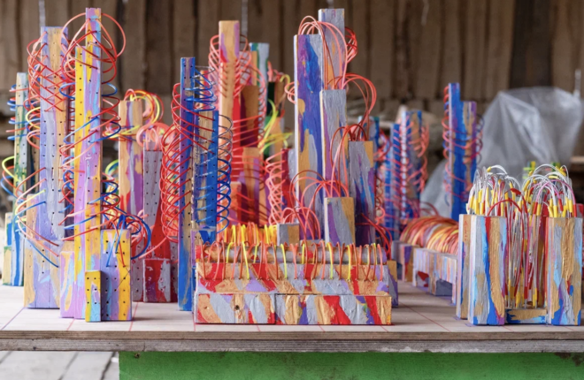 Создавая «Электроарт», художник использовал в качестве материалов дерево и лозу.