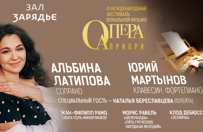 Солистка Большого театра, номинант премий «Золотая Маска» и Casta Diva Альбина Латипова (сопрано) и профессор Московской консерватории Юрий Мартынов откроют IX фестиваль «Опера Априори», который представляет три камерных программы. Концерт состоится в зале «Зарядье» 31 октября.
