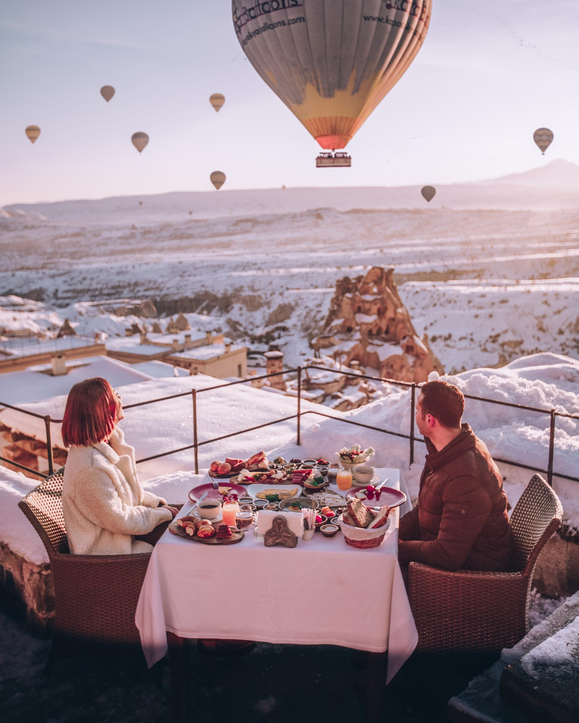 Для тех, кто хотел бы насладиться удивительным зрелищем взмывающих в воздух разноцветных шаров на фоне заснеженной долины наедине друг с другом, в отеле накроют особый романтический завтрак на рассвете. Этот завтрак будет подан не в ресторане, как для других гостей, а на террасе рядом с подогреваемым бассейном, где можно искупаться с видом на Голубиную долину и заснеженную вершину горы Эрджияс.