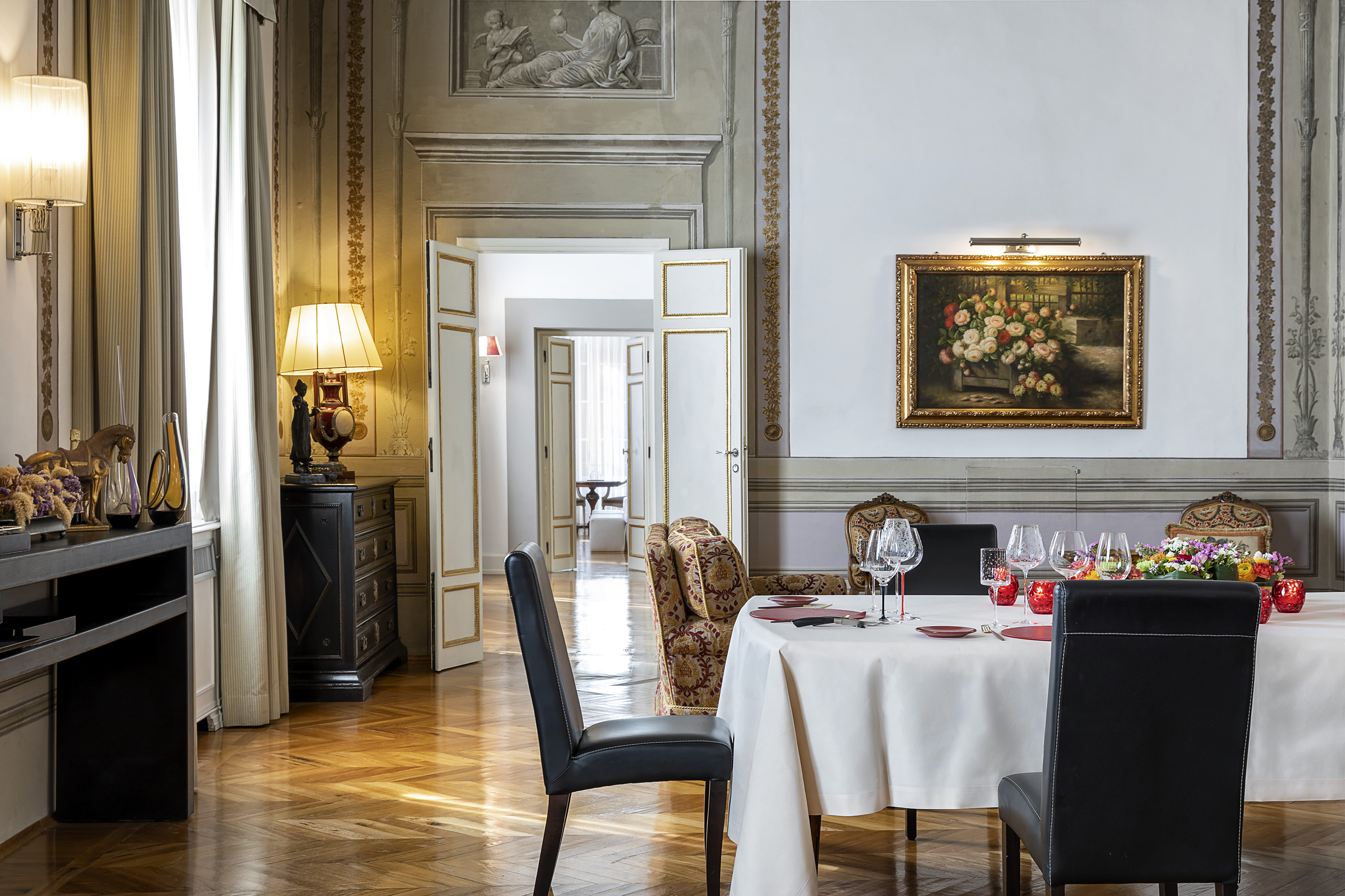 Royal Suite – один из самых просторных люксов во Флоренции. Расположен на верхнем этаже палаццо, отдельно от основной части отеля. В интерьере люкса – оригинальные фрески и картины XVIII века, кессонные потолки и старинная мебель.