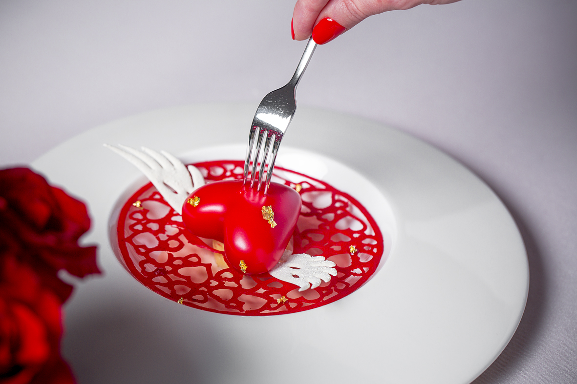 Шеф-кондитер Игорь Мельников приготовил особый десерт – сердце на кружеве из тюлипного теста раскроет свой вкус сладостью земляники, ароматом ванили и нотками миндаля.