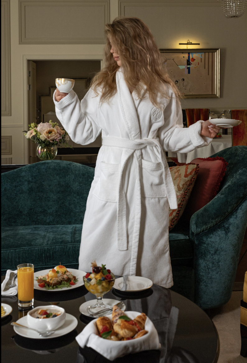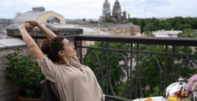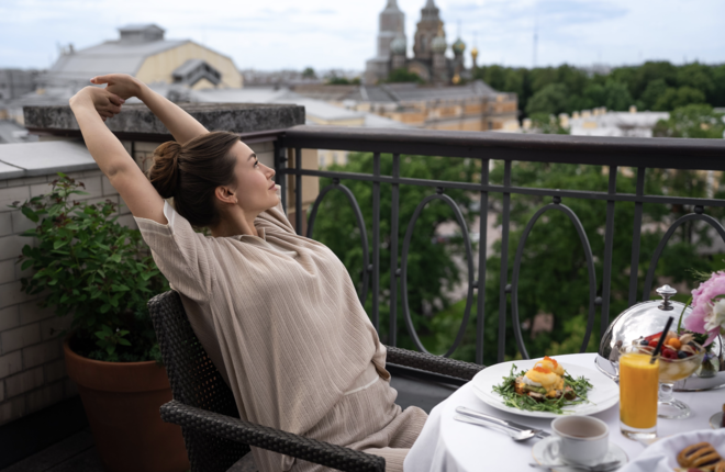 Завтрак можно подать прямо в номер. Летом популярностью пользуются номера с террасами и видом на Петербург.
