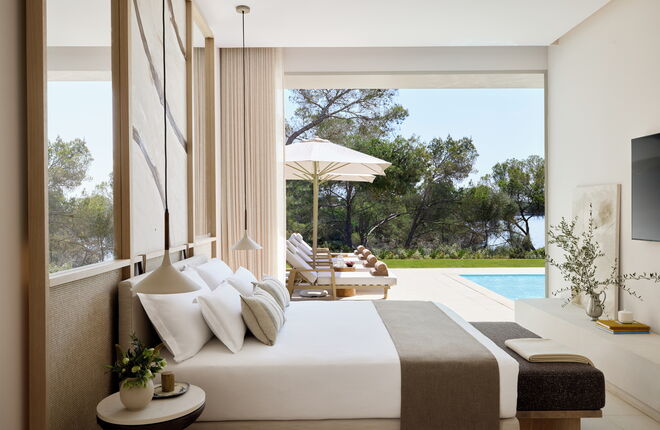 На греческом курорте Ikos Odisia появятся просторные двухуровневые бунгало площадью до 360 м², рассчитанные на размещение до семи человек. У бунгало будет свой доступ к пляжу и виды на природные ландшафты острова.