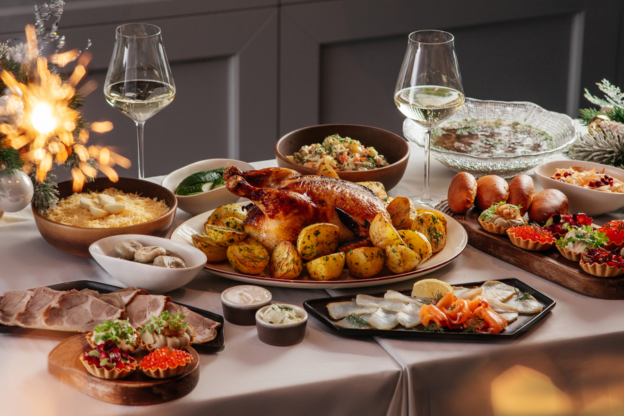 В стол сервируют фирменные новогодние специалитеты, основные курсы горячего, сет из десертов и рождественских угощений, два бокала игристого и безалкогольные напитки.