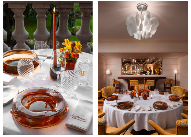 Специально для ресторана les Ambassadeurs отеля Metropole Monte-Carlo художник по стеклу Джереми Максвелл создал тарелки необычной формы, которые он вручную выдувал из стекла без использования специальной формы и инструментов.