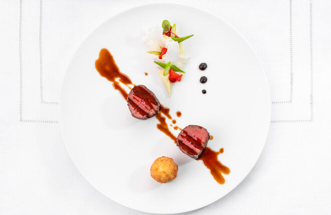 Среди закусок – карпаччо из свеклы со сливочно-соленым овечьим сыром, салат из краба со свежим манго, авокадо и осетровой икрой, малосольный лосось с дымком, филе пряной утки с пюре из топинамбура и груши, лангустин с кремом из баклажана и многое другое.