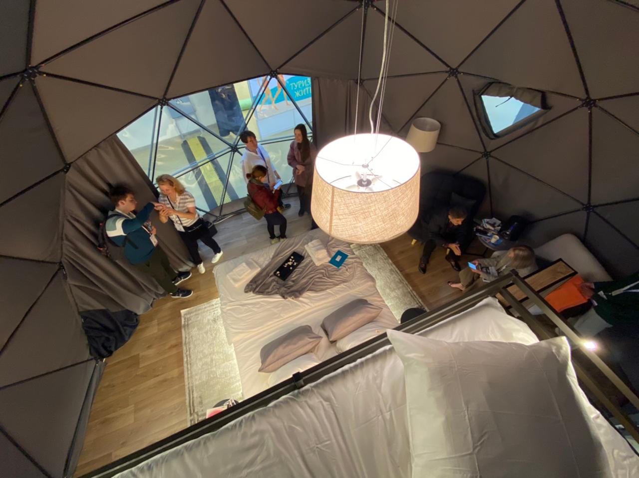 На выставке компания КуполХолл представила интересное решение для глэмпингов в самых красивых местах России – полноценный жилой купол с дизайнерским ремонтом. Глэмпинг – это относительно новое предложение на рынке экотуризма в России, возможность совмещать удобство пятизвездочного отеля и экологичность кемпинга.