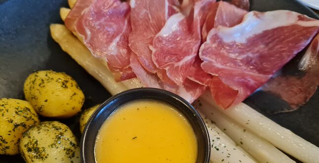 К белой спарже можно добавить: сыровяленую ветчину (600 руб.), копченый лосось (950 руб.), щупальца осьминога (1200 руб.), стейк из лосося (2300 руб.), стейк из тунца с осетровой икрой (2800 руб.) или венский шницель (850 руб.).