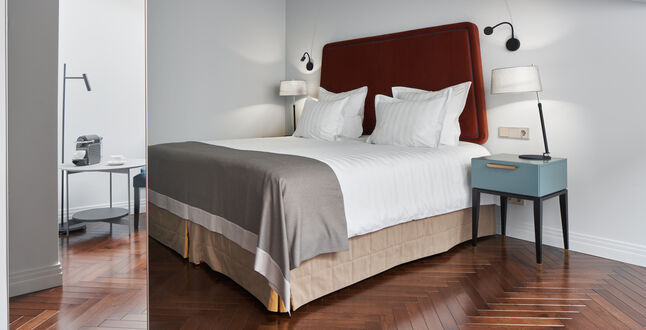 Главный герой сезона – представительский люкс. с панорамными окнами в пол, гостиной, спальней и собственной спа-зоной и джакузи с видом на улицу Марата. Любоваться Петербургом можно и с французского балкона. Площадь люкса – 80 квадратных метров, высота потолков – 4 м 70 см. Представительский люкс можно объединить через коридор с соседним, окна которого выходят во двор.