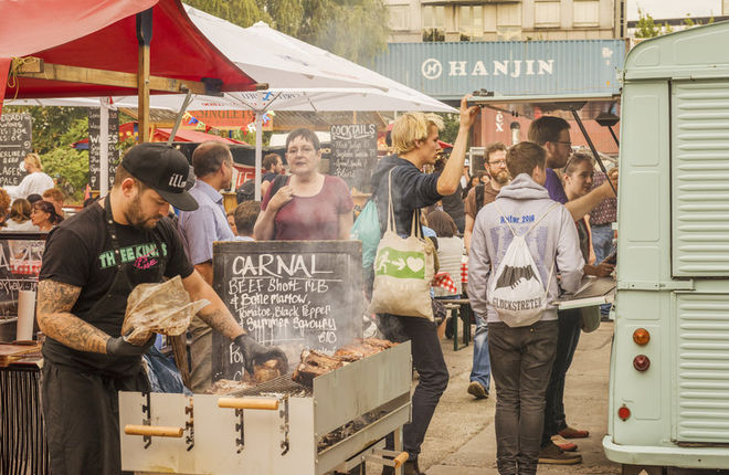 Каждое воскресенье на улице Зредцкиштрассе в округе Пренцлауэр-Берг работает рынок уличной еды. Десятки жителей Берлина выстраиваются к фургонам, где продают не только сосиски, но и тушеную свинину, и блинчики, и гамбургеры, и даже фондю.