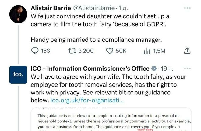 Когда они поделились историей в соцсетях, Управление информационного комиссара всё подтвердило с официального аккаунта – съемки зубной феи без ее согласия нарушают GDPR.