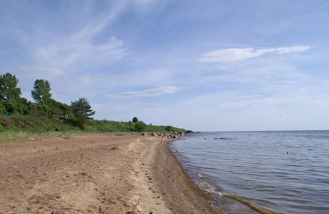 Восточная часть берега начинается с низменности, поросшей разнообразными травами и мелкими кустарниками, затем появляются крутые возвышенности и песчаные дюны, которые островками возвышаются посреди болотистой долины. Южнее береговая местность почти вся покрыта валунами финляндского гранита. Неглубокие овраги, по которым текут мелкие речушки и ручьи, разделяют низину.