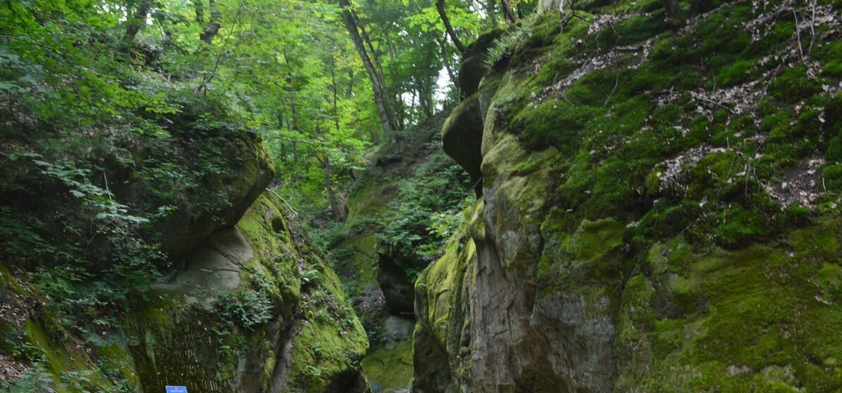 Этот проход разделил горные склоны. Со временем, человек вырубил на дне ущелья каменную лестницу для удобства прохода к целебным источникам. Она насчитывает 49 ступеней. Перед входом располагается облагороженная поляна, которая придает особое очарование этому месту. Наибольший колорит Дантовой лестнице придают песчаниковые скалы, которые поросли многолетним мхом. Когда проходишь между ними, попадаешь в загадочный мир.