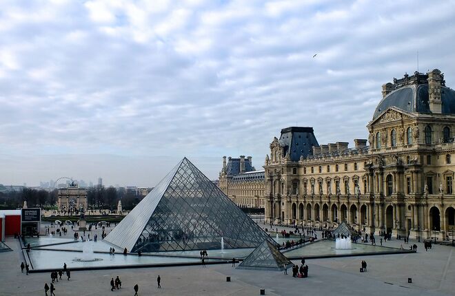 Участники Dernière Rénovation облили оранжевой красной пирамиду Лувра.>
