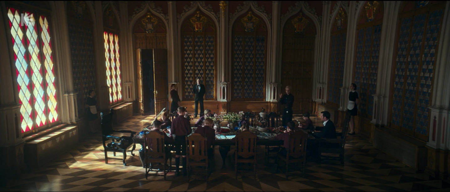 Также в кадре легко узнать интерьеры с красивыми ромбовидными витражами особняка Паскевича. Именно там снимают сцену, в которой дети готовятся к балу и составляют букеты.