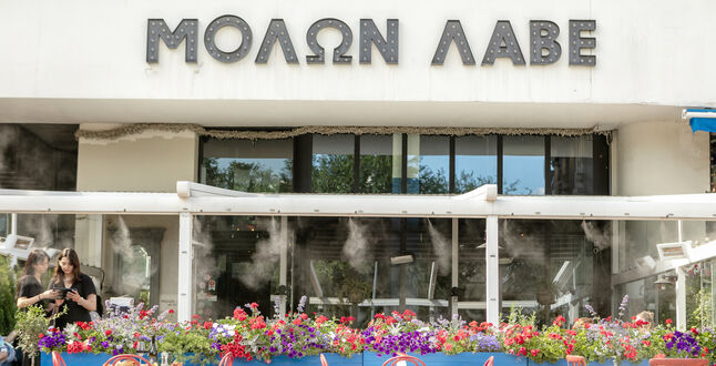Греческий ресторан ΜΟΛΩΝ ΛΑΒΕ открыл летнюю веранду, напоминающую о пляжных ресторанх Санторини. Там уже начали подавать холодный кофе Freddo.