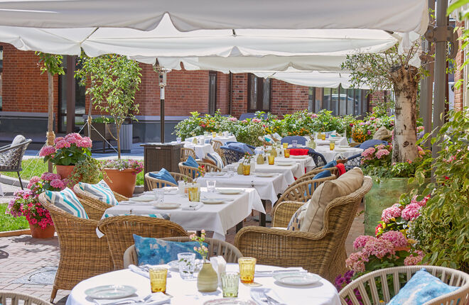 Оливковые деревья, кашпо с гортензиями, огромный фонтан и мягкие плетеные кресла создают тот самый средиземноморский колорит на аутентичной веранде в греческом ресторане Meraki.