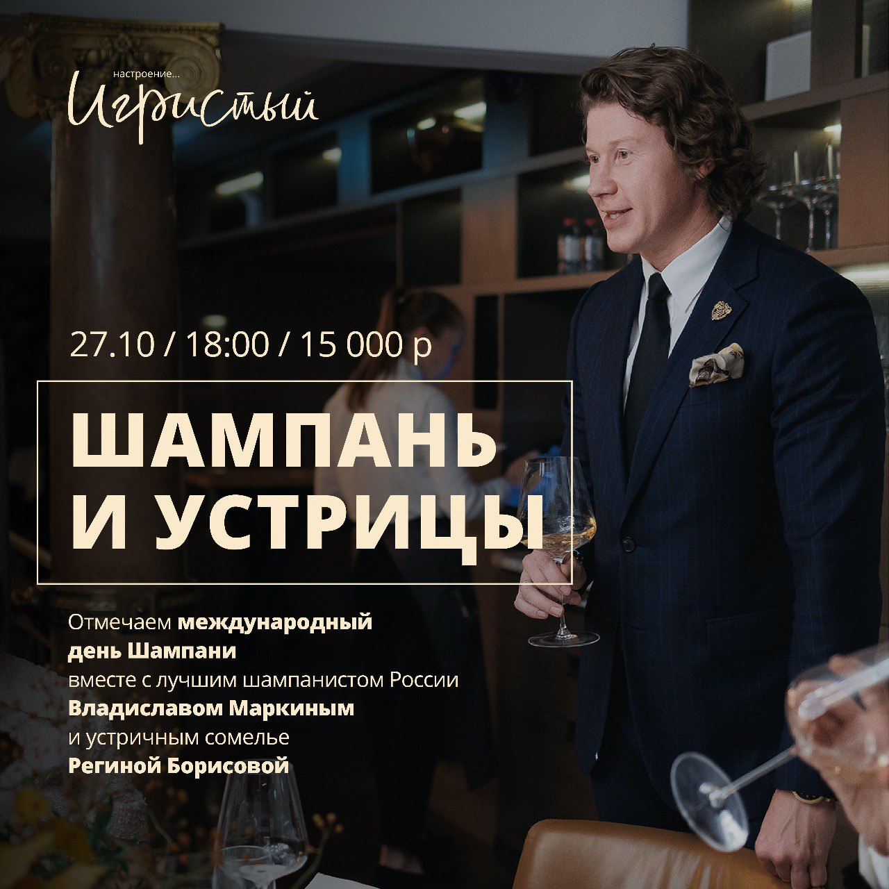 В «Игристом» Международный день шампанского начнут отмечать 27 октября в 18:00. В программе дегустация с Владиславом Маркиным, лучшим сомелье России 2013, членом Совета Правления РАС и членом жюри Russian Wine Awards, а также с устричным экспертом Региной Борисовой.