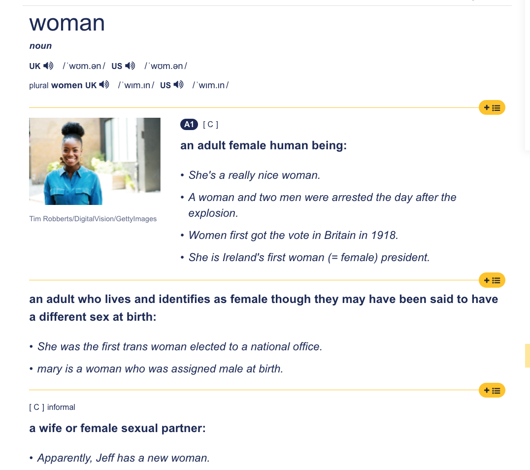 Кембриджский словарь добавил второе значение слова «женщина»: «взрослый, который живет и идентифицирует себя как человек женского пола, хотя мог родиться с другим гендером» («an adult who lives and identifies as female though they may have been said to have a different sex at birth»)