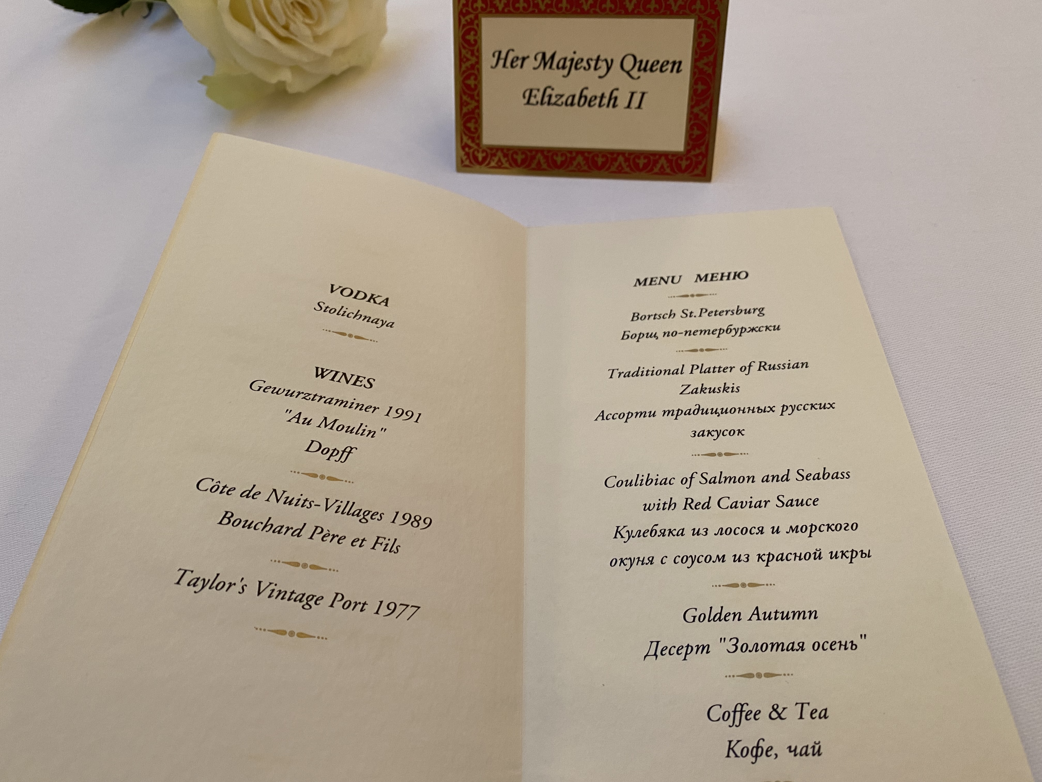 Согласно протоколу, Ее Величество может совершить официальный визит в другое государство только единожды, все последующие поездки считаются обыкновенными путешествиями. Этот факт учитывался при составлении меню обеда: во время визита в Петербург королеве нужно было предложить лучшие блюда русской кухни. Так, в список вошло блюдо, состоящее из пяти миниатюр традиционных закусок: блин с икрой, заливное, осетрина с хреном, столичный салат и говяжий язык. Было создано особое угощение – десерт «Золотая осень» – марципановое яблоко с начинкой из мусса. Открывал обед борщ по-петербуржски с копчеными ребрами, а основным блюдом стала кулебяка из лосося и морского окуня с соусом из красной икры.