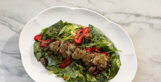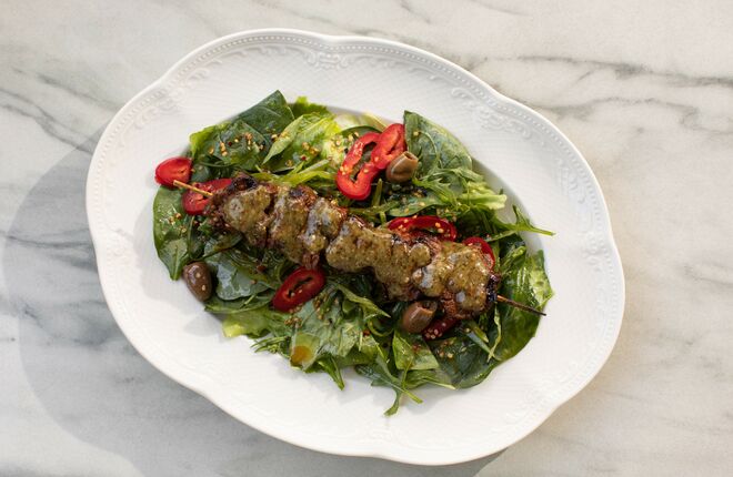 Еще одна позиция сета – телятина пинчос морунос, популярное в южных регионах блюдо с мавританскими корнями: кубики мяса, нанизанные на шампур (он же пинчо) по традиции готовят на открытом огне. Александр Челмакин маринует говяжью вырезку в гречишном меде с паприкой, кунжутным маслом и сладким чили, а в качестве сопровождения мяса он выбрал перцы рамиро, таджасские оливки и чукку из молодого горошка.