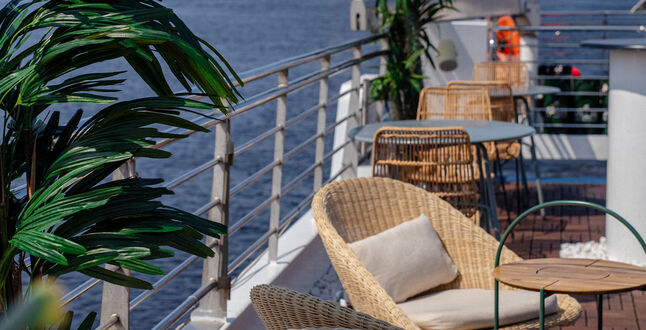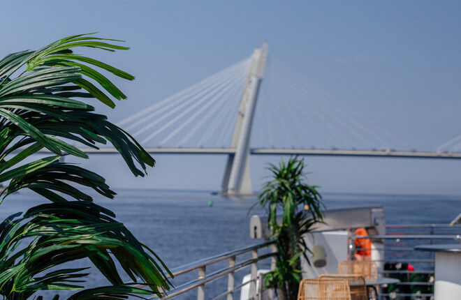 На нижней палубе Cruise by Kuznyahouse – ресторан на воде с панорамными окнами, винтажной мебелью, немецким кабинетным роялем 1979 года и «морское» меню в стиле comfort food от шеф-повара Руслана Закирова. Наверху — открытая палуба с лежаками, пальмами и коктейлями.