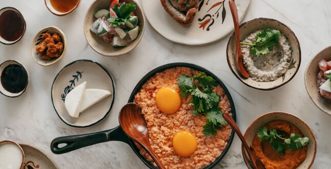 В меню на двоих – яичница с томатами и печеными перцами, колбаски из индейки, дачный салат, мягкий молодой сыр и теплая лепешка, кабачковая икра и запеченный баклажан с каймаком. На сладкое – оладьи из печи с каймаком, медовым взбитым маслом бал май и красным творогом корт, пончики кабартма, а также татарский чай с вареньем. Цена завтрака – 2500 рублей.