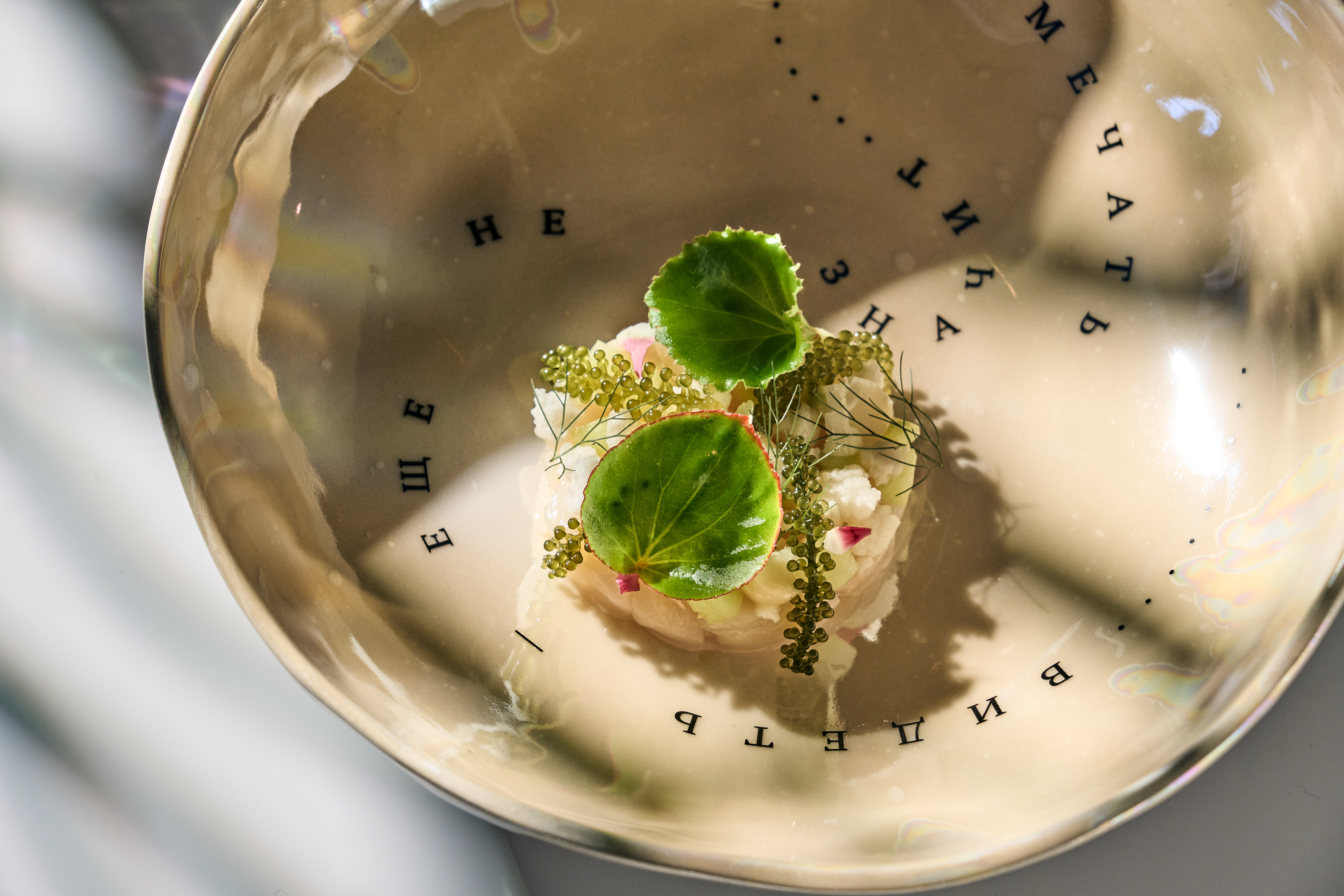 Следующий курс — морской гребешок. Мы подаем его с маринованной цветной капустой и свежим огурцом, морским виноградом и орехом макадамии. Всё объединяет заправка из цветной капусты, юдзу и ванили.