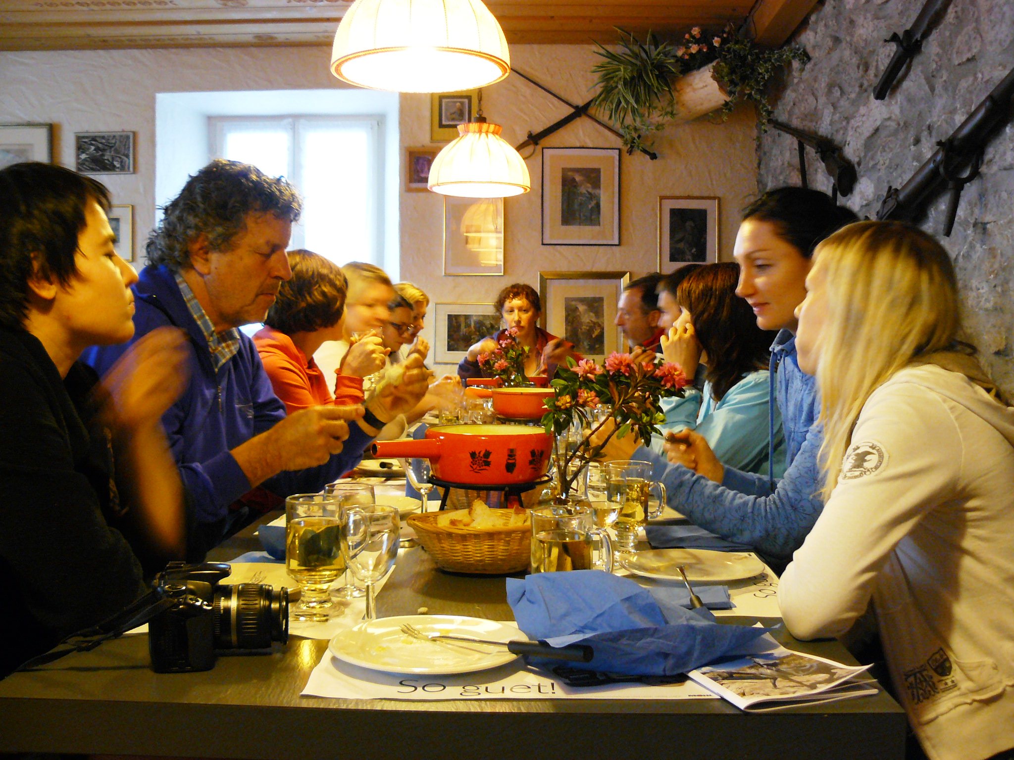 Во время нашего путешествия на перевал мы обедали в доме кучера рядом с легендарным Чёртовым мостом, где в 1799 году произошла битва между французским и русским войсками. Здесь нам подали фондю, приготовленное на местном белом вине. Это вино можно попробовать только в кантоне Ури. Вина Швейцарии, как известно, практически не экспортируются, поскольку швейцарцы выпивают их сами, они почти не известны иностранцам. Тем не менее, здешние вина не уступают по уровню итальянским или французским. Фондю было очень кстати — погода в этот день выдалась пасмурная, почти все время пришлось идти в густом тумане, который был образован облаком, накрывшим горы. Сыр нескольких сортов, расплавленный в горячем вине, традиционно использовался местными жителями как средство разогреться во время зимних холодов и промозглой погоды. Несмотря на высокую влажность и весьма условную видимость, туман только прибавил прелести всему путешествию. Он сделал виды, открывавшиеся на легендарный Чёртов мост и водопады, ещё более романтическими.