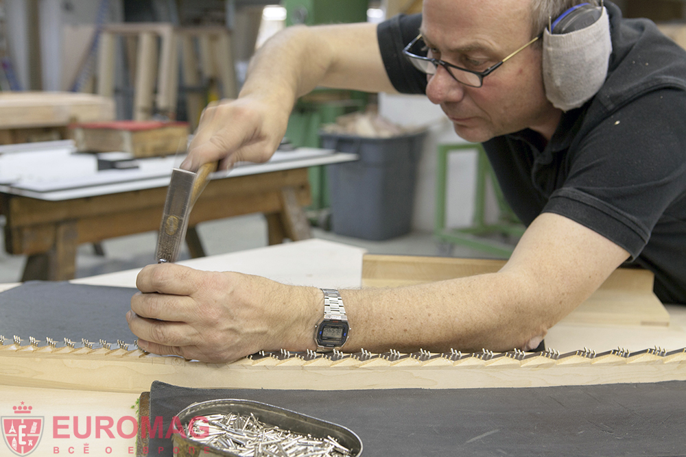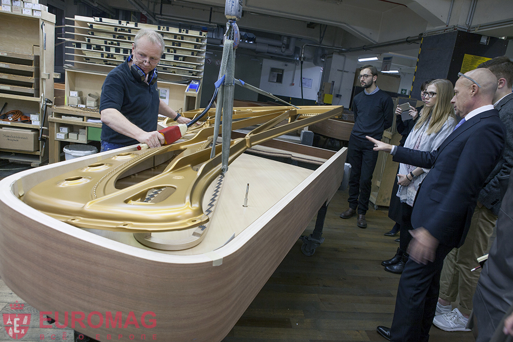 Один из самых ответственных моментов - так называемая «свадьба», когда в деревянный корпус, склеенный из 19 слоев древесины, которому при помощи 100-летних станков придали его крылоподобную форму, входит резонаторная дека, которую накрывают чугунной цельнолитой рамой, воспринимающей нагрузку, страшно сказать, около 20 тонн. Все это должно идеально подходить друг к другу, в противном случае все отправляется на доработку.