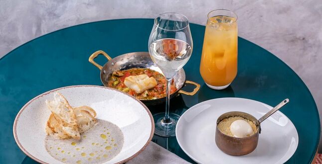 В дневном меню – риет из утки и корнеплодов с желе из облепихи, паштет из печени цыплёнка с конфитюром из кураги, зелёный салат с артишоками и рагу из запеченных перцев и баклажанов. Для тех, кто не мыслит зимнего обеда без тарелки согревающего супа, готовят луковый суп с пармезаном и крем-суп из белых грибов и шампиньонов. Из горячих блюд можно выбрать между курицей Гастона Жерара, томлённого в красном вине ягненка или палтуса с томатами и бобами эдамаме. Для завершения обеда рекомендуют яблочный крамбл или профитроль, а к ним – эспрессо или чай ассам. Альтернативно в качестве основного напитка к обеду можно выбрать лимонад – персиковый либо грушевый.