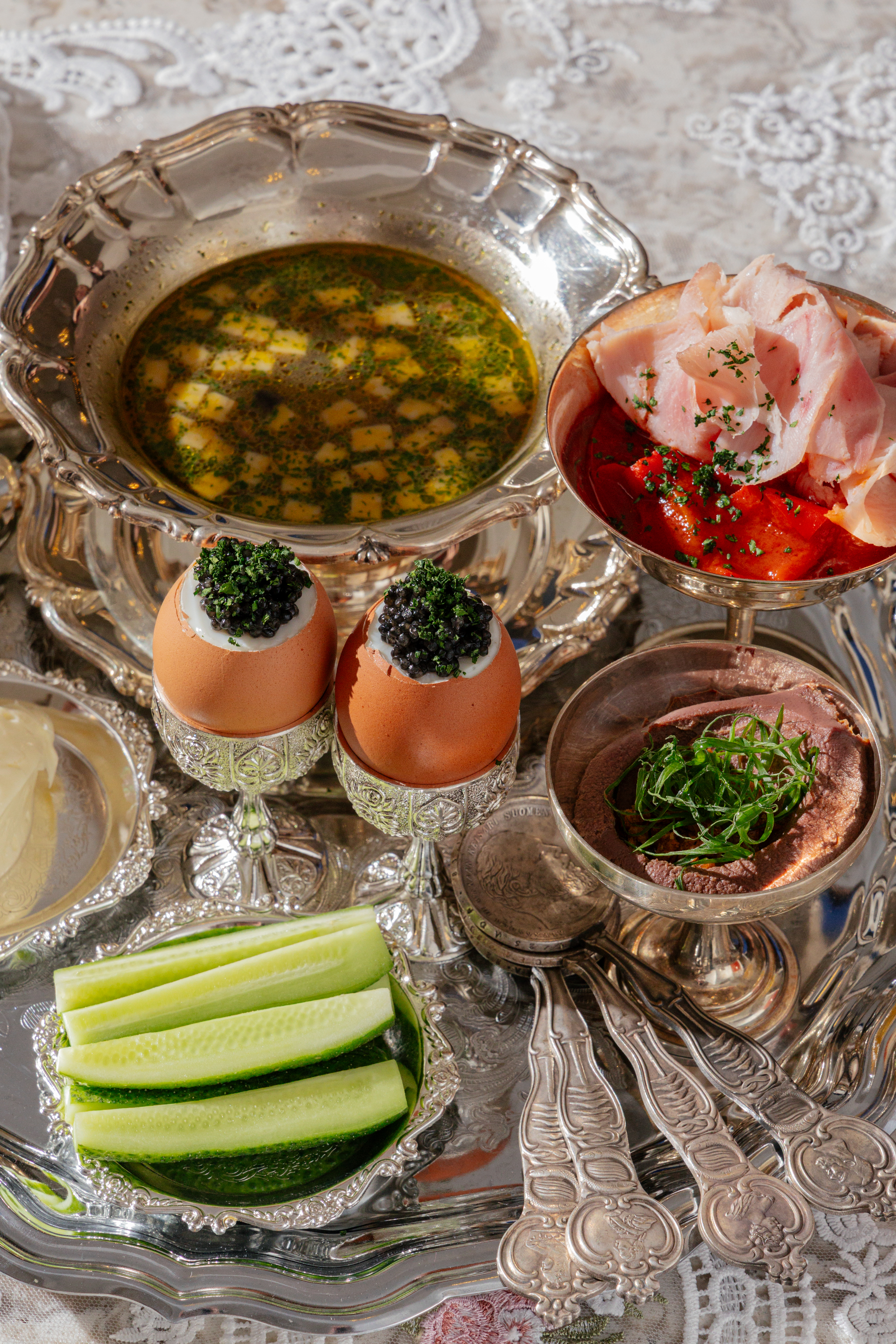 «Завтрак графа» – сытный и основательный: яйца всмятку с черной икрой, паштет с луком фри и соленым маслом, сырники со сметаной, свежие огурцы и лечо с тамбовским окороком. В центре – похлебка с дичью и белыми грибами, отсылающая к охотничьим традициям русского дворянства. Подают также мини-круассаны, солодовые булочки и бриошь с малиновым вареньем, яблочный пирог, эспрессо с королевским фиником, грейпфрутовый свежевыжатый сок и яблочную настойку.
