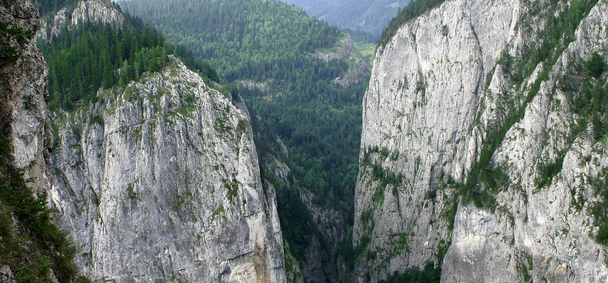 Ущелье Биказ — яркое творение природы и достопримечательность Карпатских гор. В Румынии это самый глубокий и длинный каньон. Примечательно ущелье своими непревзойденными горными пейзажами, крутым серпантином и разнообразием растительности. В окрестностях располагается загадочное Красное озеро с горой Убийца. Добавить к мрачноватому и величественному ущелью туман — декорации к фильму про Дракулу готовы.