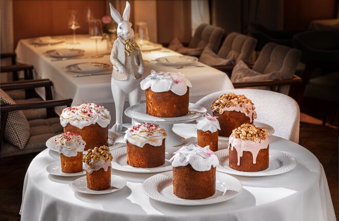 В пасхальном меню представлены три вида куличей — лимонный, с изюмом и цукатами, а также шоколадный. Каждый доступен в трех размерах, чтобы подойти как для камерного праздника, так и для большого стола.