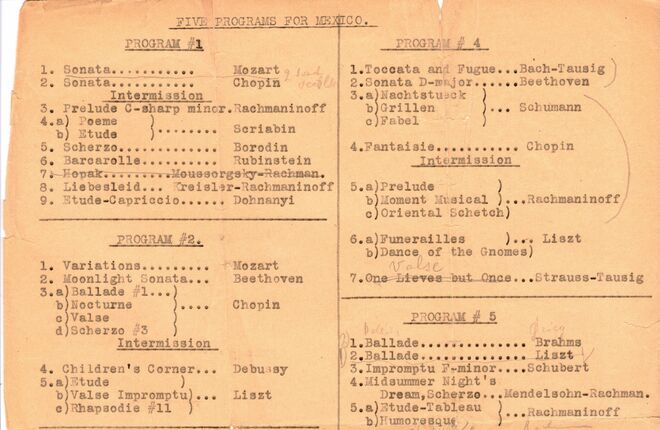 Уникальный документ относится к 1930-м годам и представляет собой машинописную программу пяти концертов Рахманинова в Мехико с перечнем намеченных к исполнению сочинений. Особую ценность ему придают рукописные пометы самого композитора – изменение и уточнение списка произведений. Известно, что гастроли Рахманинова – пианиста в мексиканской столице так и не состоялись, что делает документ еще более важным для изучения творческой биографии Сергея Васильевича.