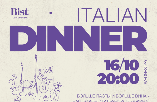 16 октября в 20:00 ресторан Bist организует большой итальянский ужин под лозунгом «Cibo e Vino» («Еда и вино»).