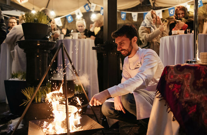 Рестораны и бары — участники «Пикника Гельвеции под ёлкой» — приготовят для гостей тематические блюда и напитки той эпохи: тазик домашнего оливье от Александра Богданова (Cafe Claret), голубцы с креветкой и красной икрой от Константина Колосова («Огородники»), сельдь под шубой с крабом и щучьей икрой от Александра Карюкина («Сыроварня»), щи с квашеной капустой от Романа Васильева («Катюша»).