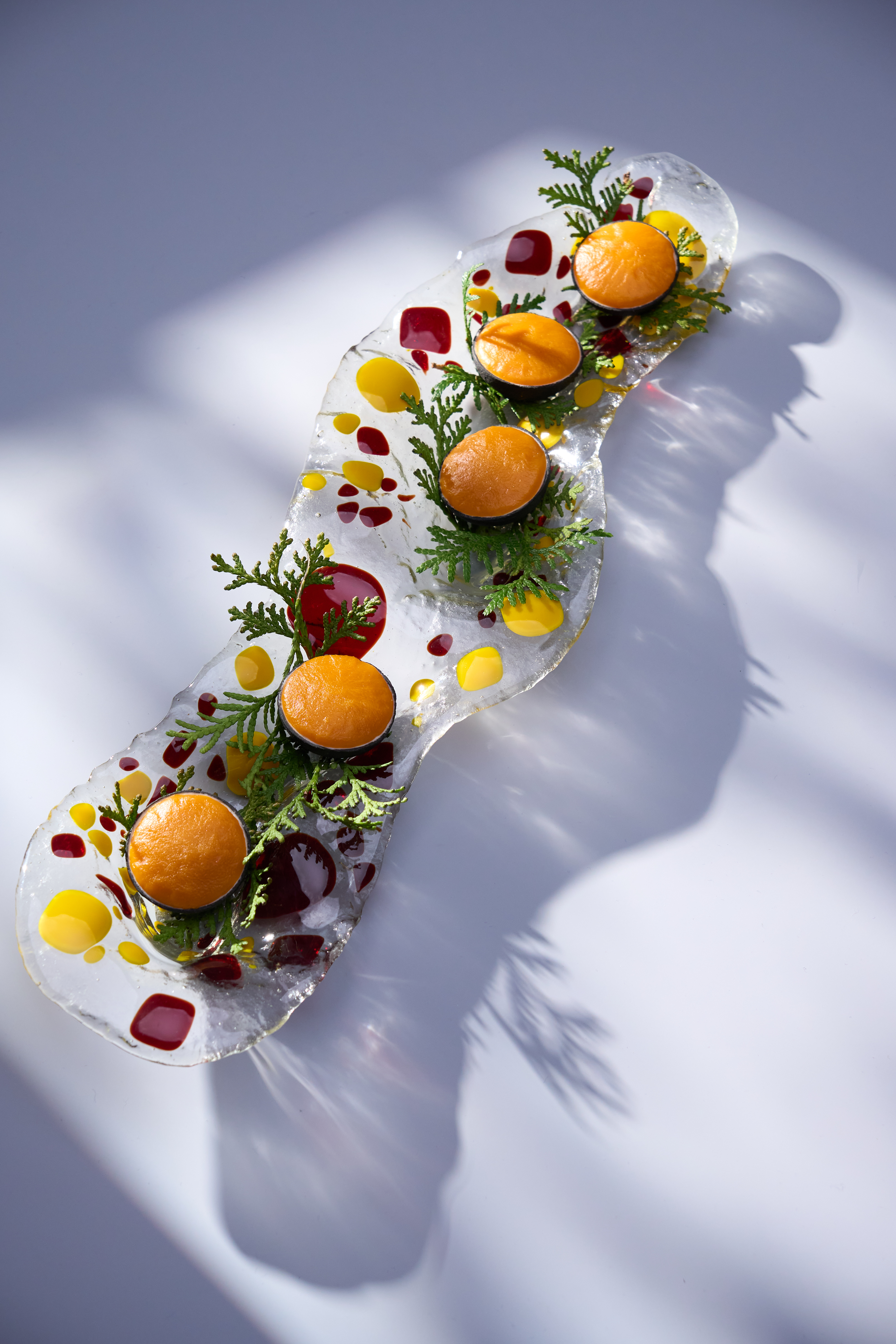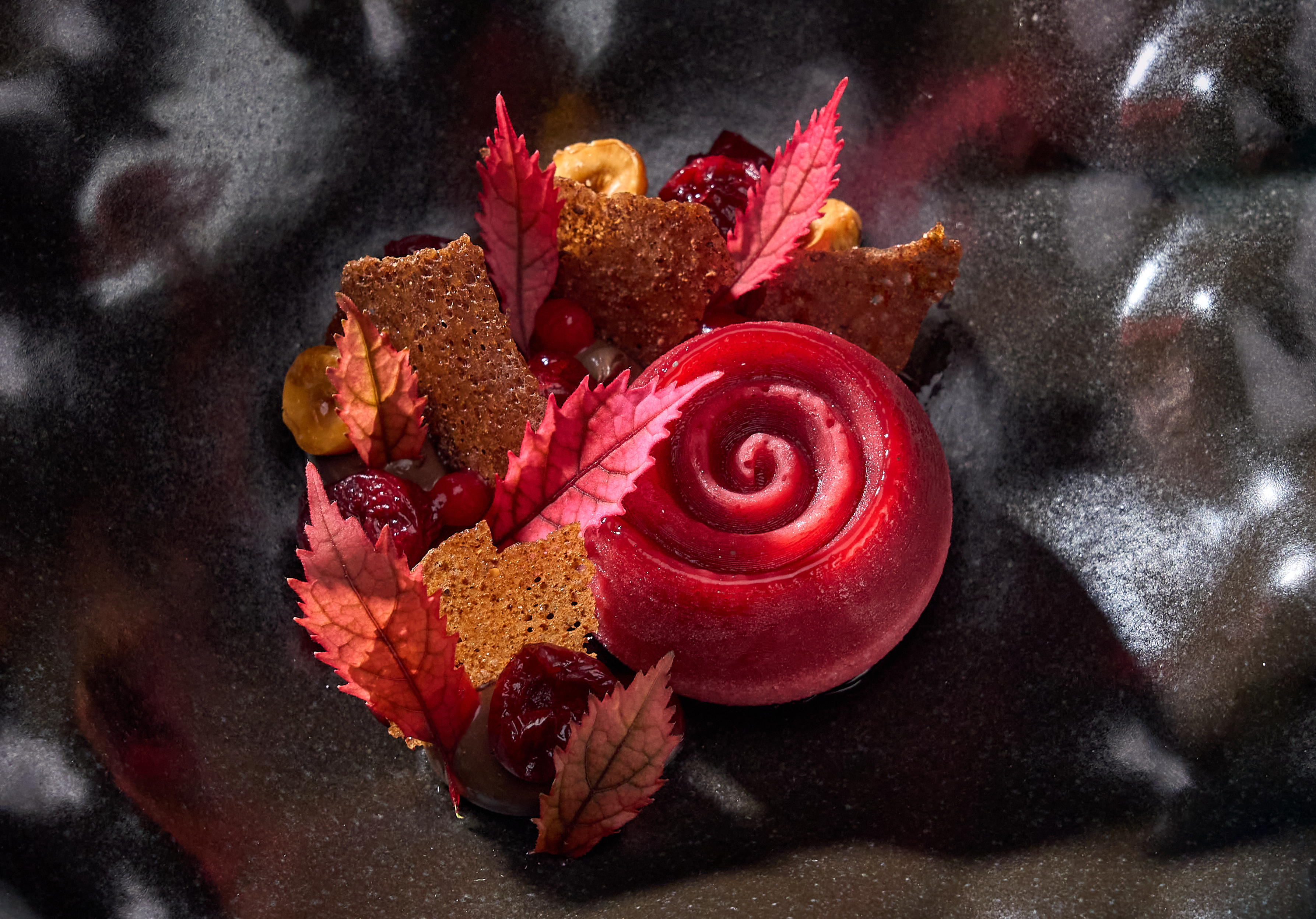 Традиционную запеченную утку шефы подают с сухофруктами, восстановленными в вермуте, сельдереем и фейхоа. Завершают основную часть преддесерт из мандарина с лемонграссом и манго, а также основной десерт — вишня со специями и шоколадом. Финальным аккордом станут конфеты ручной работы.