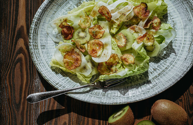Блюда преимущественно готовят на открытом огне. Чтобы сделать баклажановый крем для салата с жареными артишоками и рукколой (1390 рублей) баклажан запекают в печи, а затем заправляют кунжутным дрессингом. Авокадо и цветную капусту обжаривают на гриле и подают с соусами из томатов: авокадо больше подходят конфи и крем из маринованного артишока, а капусту идеально дополняет средиземноморский вкус с добавлением оливок и каперсов.