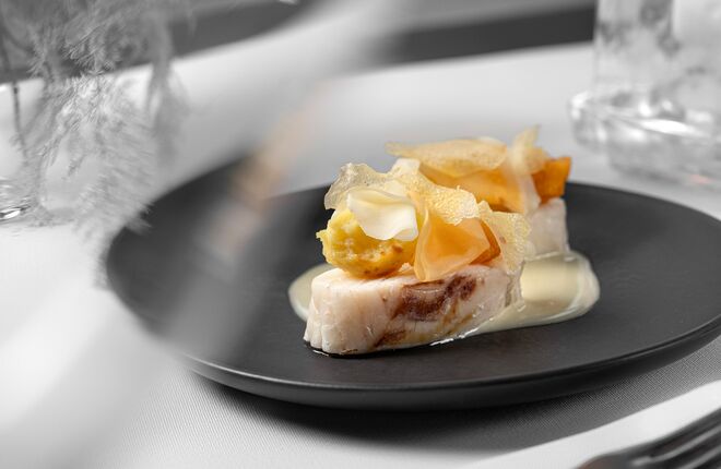 В горячем Треска / Репа / Картофель мурманская треска дополнена печеными и ферментированными овощами, а в курсе Кролик / Пастернак / Ель нежная вырезка кролика гарнируется пастернаком в нескольких текстурах и соусом на основе еловых побегов: это история о зимних переменах – как в питании, так и в образе жизни.