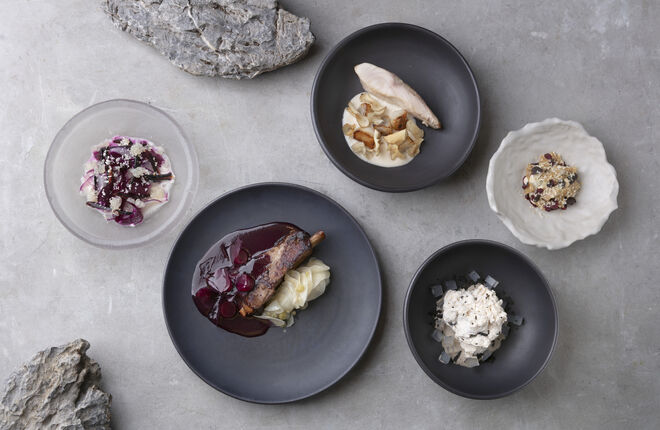 В закуске корнеплоды / икра палтуса / сыворотка сочетаются свекла, фиолетовая редька и фиолетовая морковь, дополненные икрой палтуса и заправкой на основе сыворотки. Каждый корнеплод обрабатывается в своей особой технике: ферментация, маринование или соление.