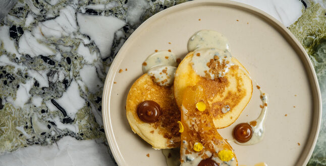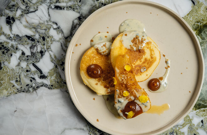 Интересные твисты у шефа получились на пиццу и пасту, например блины а-ла качо э пепе с тартаром из свежей креветки и соусом биск (750 рублей), блинная лазанья с мясным рагу и соусом бешамель (780 рублей) и панкейки с томленой грушей и сыром горгонзола, посыпанные вафельной крошкой, карамелью и лепестками цветов (500 рублей).