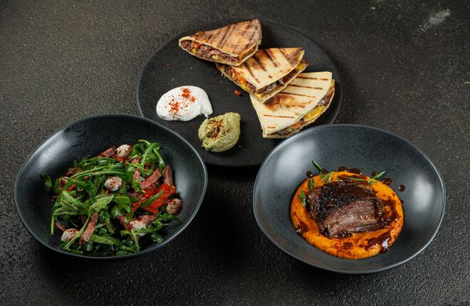 Второе блюдо — кесадилья с томлеными ребрами и халапеньо (2800 руб.). Кукурузная тортилья подается с двумя видами сыра: чеддер и моцарелла, острым перцем халапеньо, сладкой кукурузой и томлеными говяжьими ребрами.