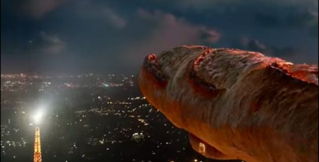 В видео игрок Национальной футбольной лиги пролетает над городом в огромном дирижабле из багета, держа в руках бокал красного вина. А скайдайверы прыгают с дирижабля и выкладывают в небе олимпийские кольца.
