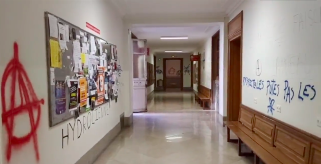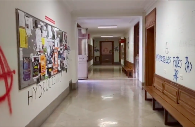 Вчера несколько сотен студентов вломились в Сорбонну и исписали стены исторического помещения Парижского университета лозунгами: «Ни Ле Пен, ни Макрон», «Революция — это долг», «Оккупированная Сорбонна». Наиболее значительный ущерб нанесен классным комнатам.