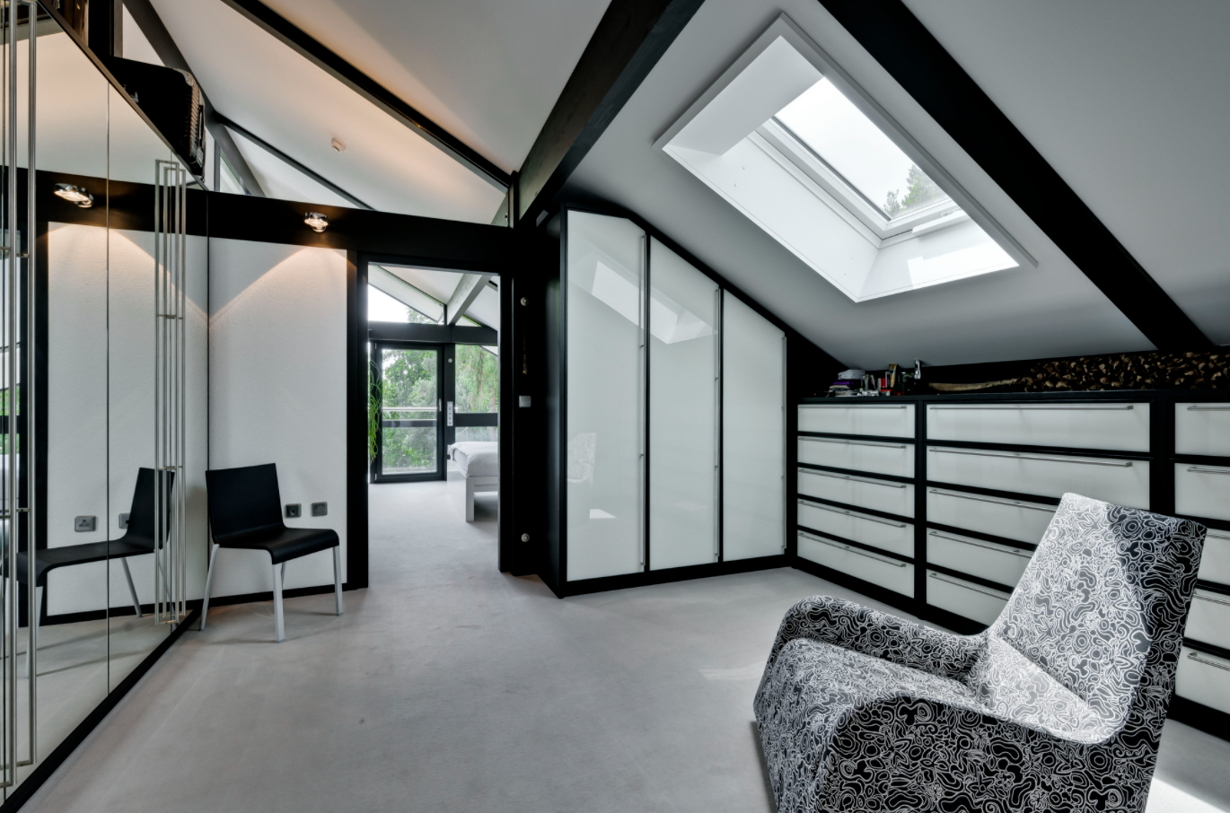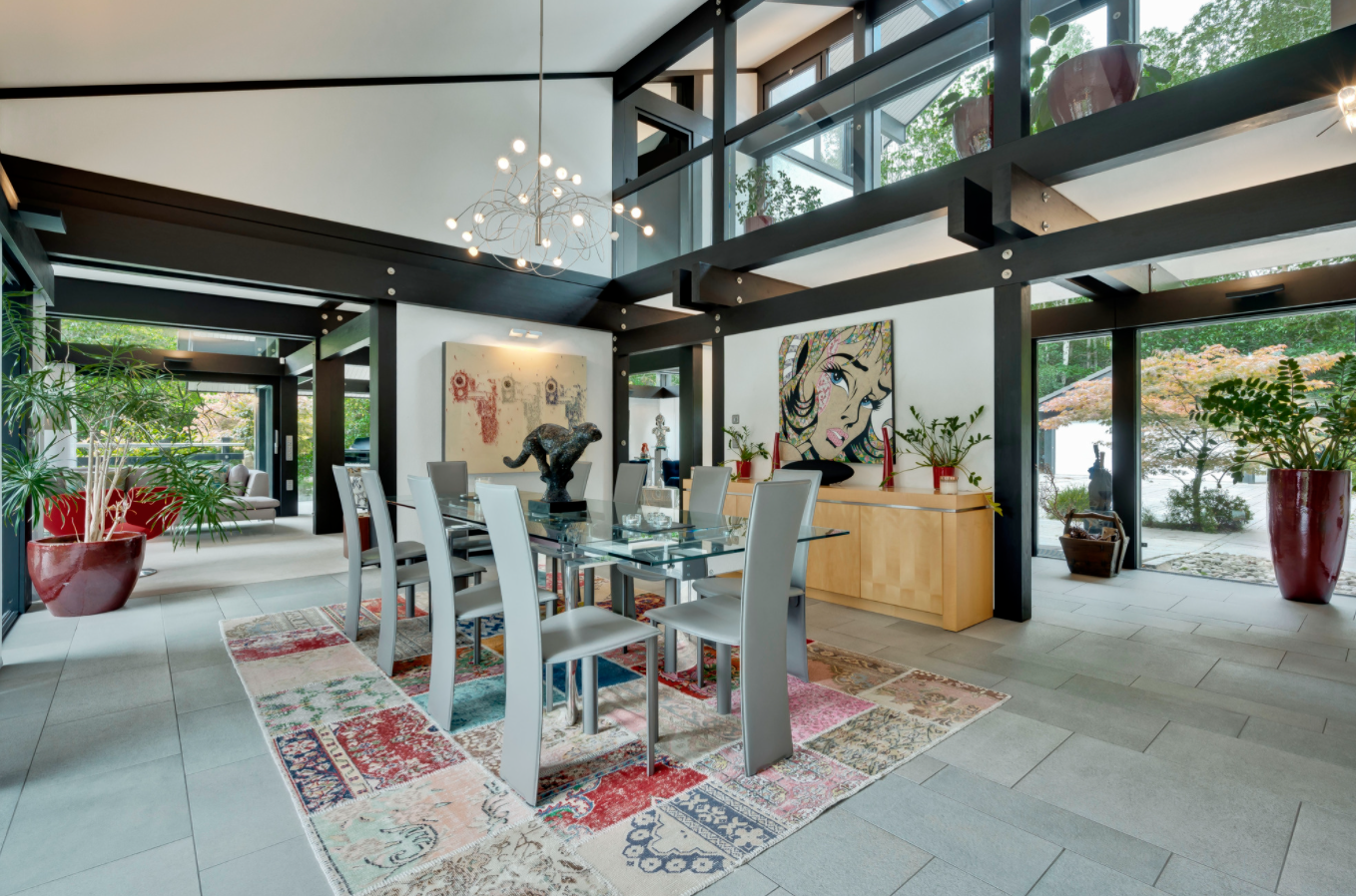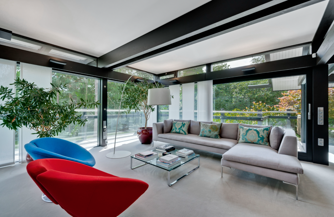 Гибкое жилое пространство расположено на трех этажах. На втором этаже - четыре отдельные жилые зоны, включая столовую, кабинет и игровую комнату, а также кухня и гардеробная, каждая комната имеет собственный балкон. Нижний этаж состоит из просторной гостиной и еще двух спален, каждая из которых выходит в патио. Также есть тренажерный зал, банно-душевой комплекс и отдельное подсобное помещение. Дом расположен на участке 4 тыс. кв.м и утопает в саду профессионально оформленном ландшафтными дизайнерами.