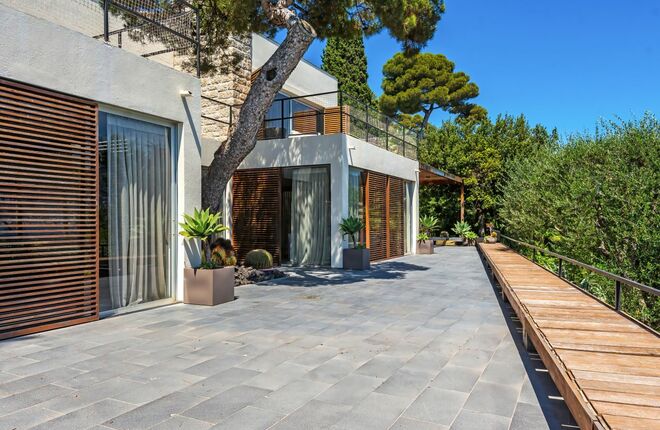 В доме есть просторные террасы с великолепным видом на море, пять спален с ванными комнатами. Снаружи, помимо просторной территории с пейзажным бассейном и кабинкой для переодевания в барочном стиле, разбиты пышные сады. Комплекс дополняют гараж, терраса с тренажерным залом, площадка для игры в петанк и комната для персонала и отдельный гостевой дом.